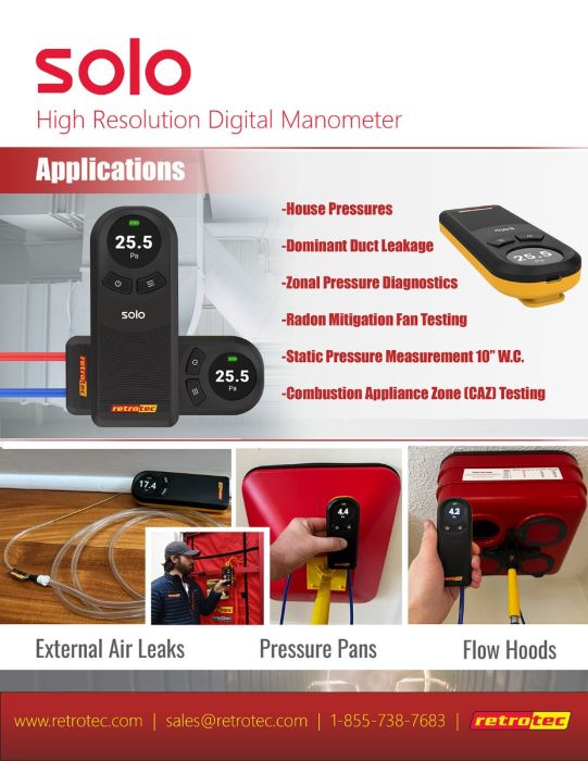 For Energy Auditors, the Solo pairs effortlessly with a running blower door. Connect the gauge to a Mini Probe or Pressure Pan & efficiently detect / pinpoint external air leaks, enhancing your energy audit capabilities.